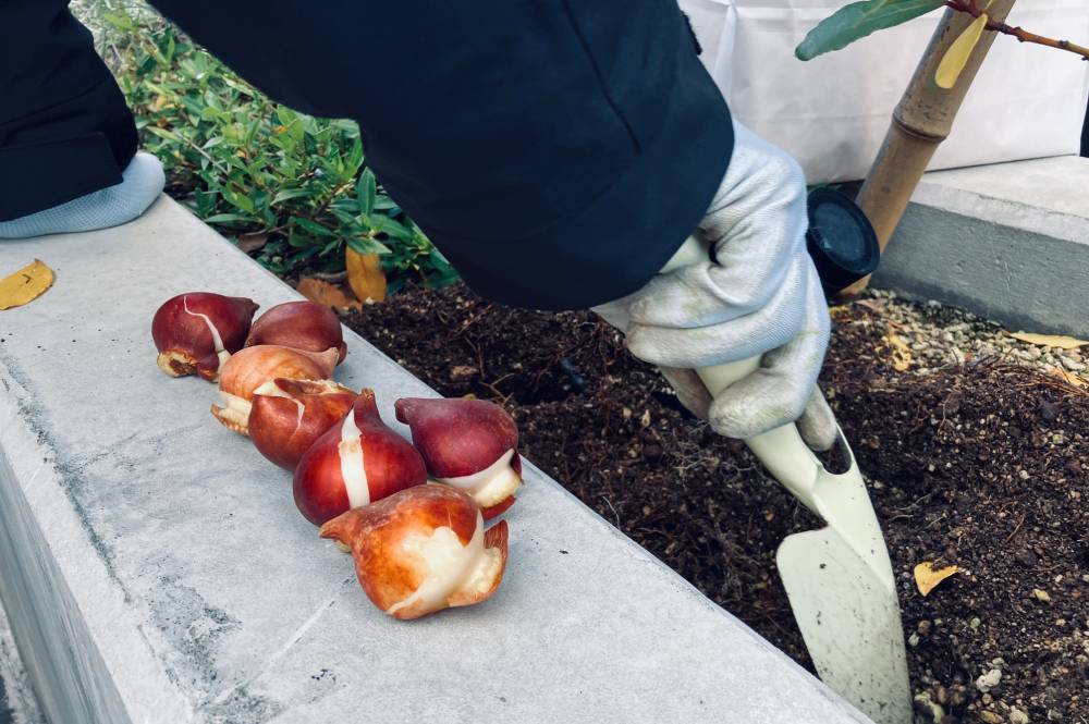 アルトスクエア花壇の一角に、花の球根を植えました。